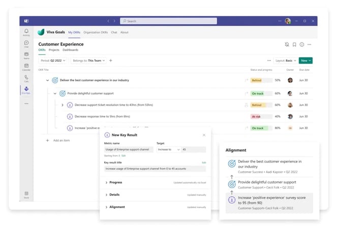 Gleichzeitig dient Viva Goals als Kanal für Feedback Ihrer Mitarbeitenden. So wird sichtbar, was für Ihre Belegschaft wichtig ist und welche Ziele die einzelnen Mitarbeitenden haben. Eine zentrale Rolle hierbei spielen Objectives and Key Results (OKRs). Dies ist eine Reihe von Massnahmen, die zusammen ein Konzept für die Zielsetzung bilden. Die OKRs setzen sich aus langfristigen, strategischen Zielen des Unternehmens, Mid-Term-Goals, Ergebnissen einzelner Projekte und regelmässigen Fortschrittsberichten zusammen. Der Ansatz von Viva Goals ist, dass nicht nur die Geschäftsleitung OKRs definiert. Vielmehr sollen Abteilungen, Gruppen und einzelne Mitarbeitende ermutigt werden, eigene Ziele zu setzen und sich mit der Geschäftsführung darüber auszutauschen. Viva Goals stellt die Umgebung bereit, um dieses Konzept in der Praxis umzusetzen.